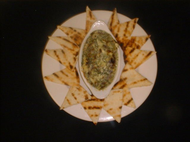 and artichoke hearts in a creamy sauce served with grilled pita points